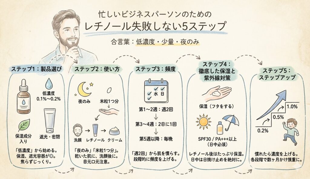 ここからは、レチノールを安全かつ効果的に使いこなすための実践ガイドです。「低濃度・少量・夜のみ」を合言葉に、5つのステップで解説します。