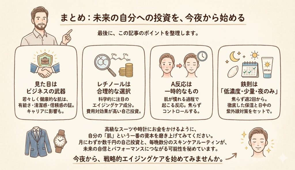 高級なスーツや時計にお金をかけるように、自分の「肌」という一番の資本を磨き上げてみてください。月にわずか数千円の自己投資と、毎晩数分のスキンケアルーティンが、未来の自信とパフォーマンスにつながる可能性を秘めています。